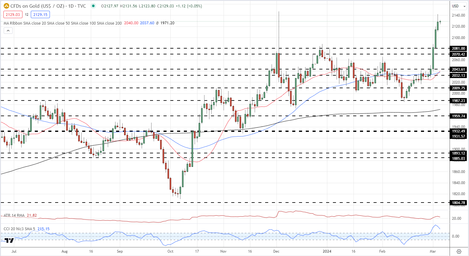 Gold’s recent rally accelerated last Friday, driven higher by weak US economic data, and the rally back towards a new all-time high has continued this week with the precious metal posting a $2,141.8/oz. peak yesterday. This left gold just $3 short of printing a new ATH. The technical outlook for gold remains positive and suggests that the precious metal will continue to move higher.