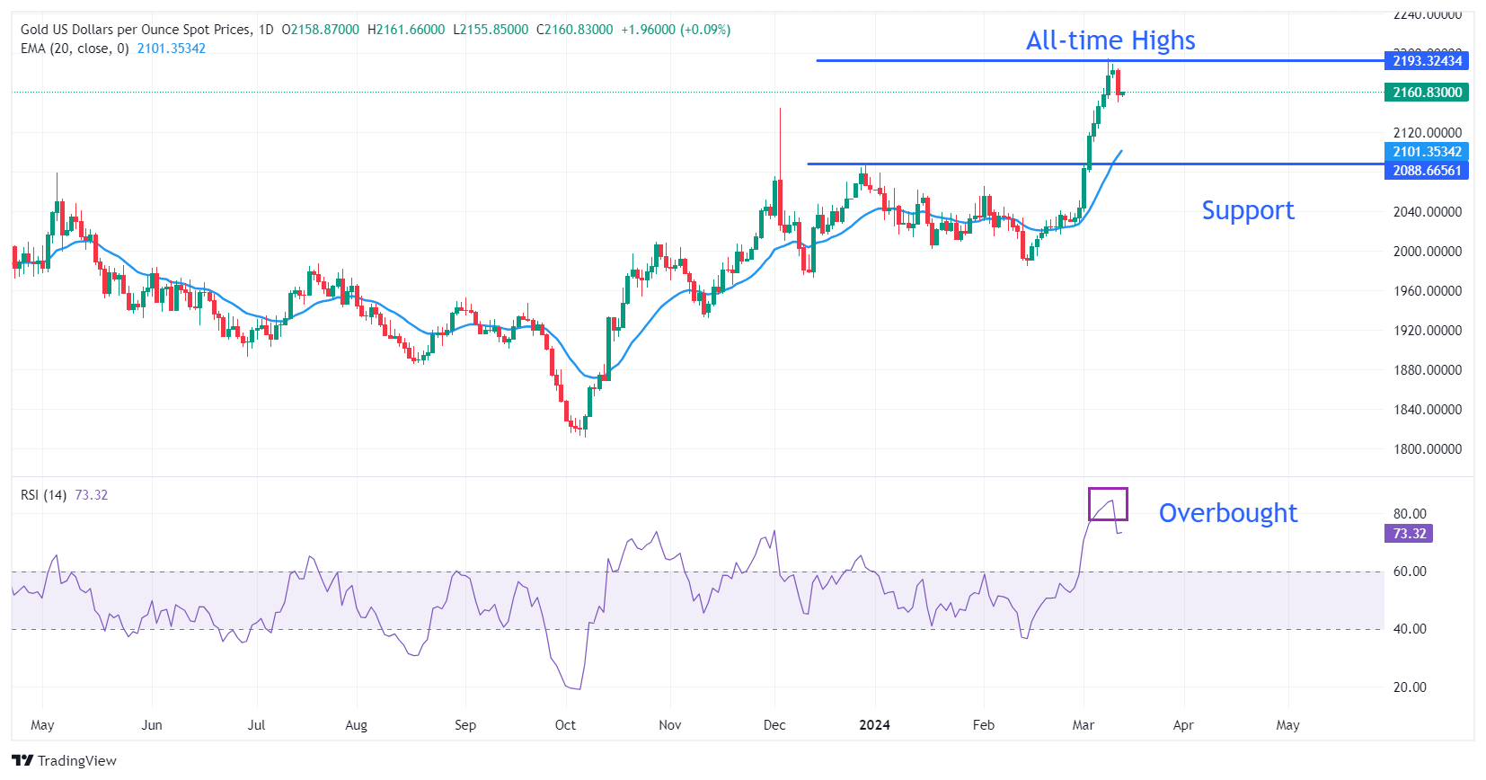 - Gold price finds temporary support near $2,160 after a sharp decline from all-time highs at $2,195. The surprisingly stubborn United States inflation data for February has cast doubts over expectations for the Federal Reserve reducing interest rates in the June policy meeting.