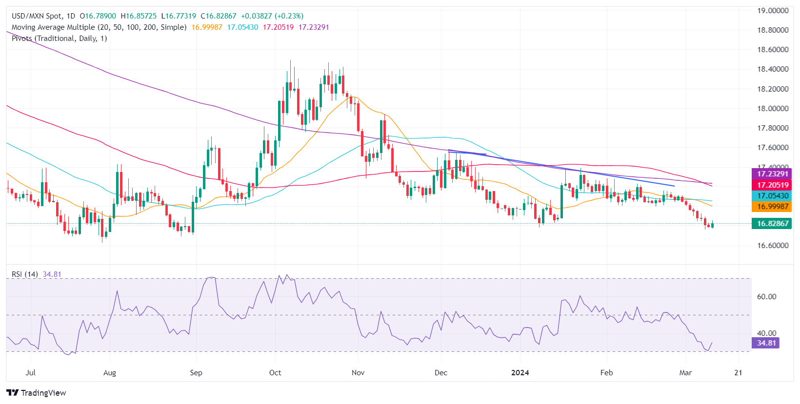 The Mexican Peso loses some ground on Tuesday against the US Dollar, which appreciated following February’s inflation report in the United States that showcased price level growth remaining stubbornly high. This led to the selling of US Treasuries. Consequently, yields rose, a tailwind for the Greenback. The USD/MXN trades at 16.81, up 0.14%, after hitting a daily low of 16.76.