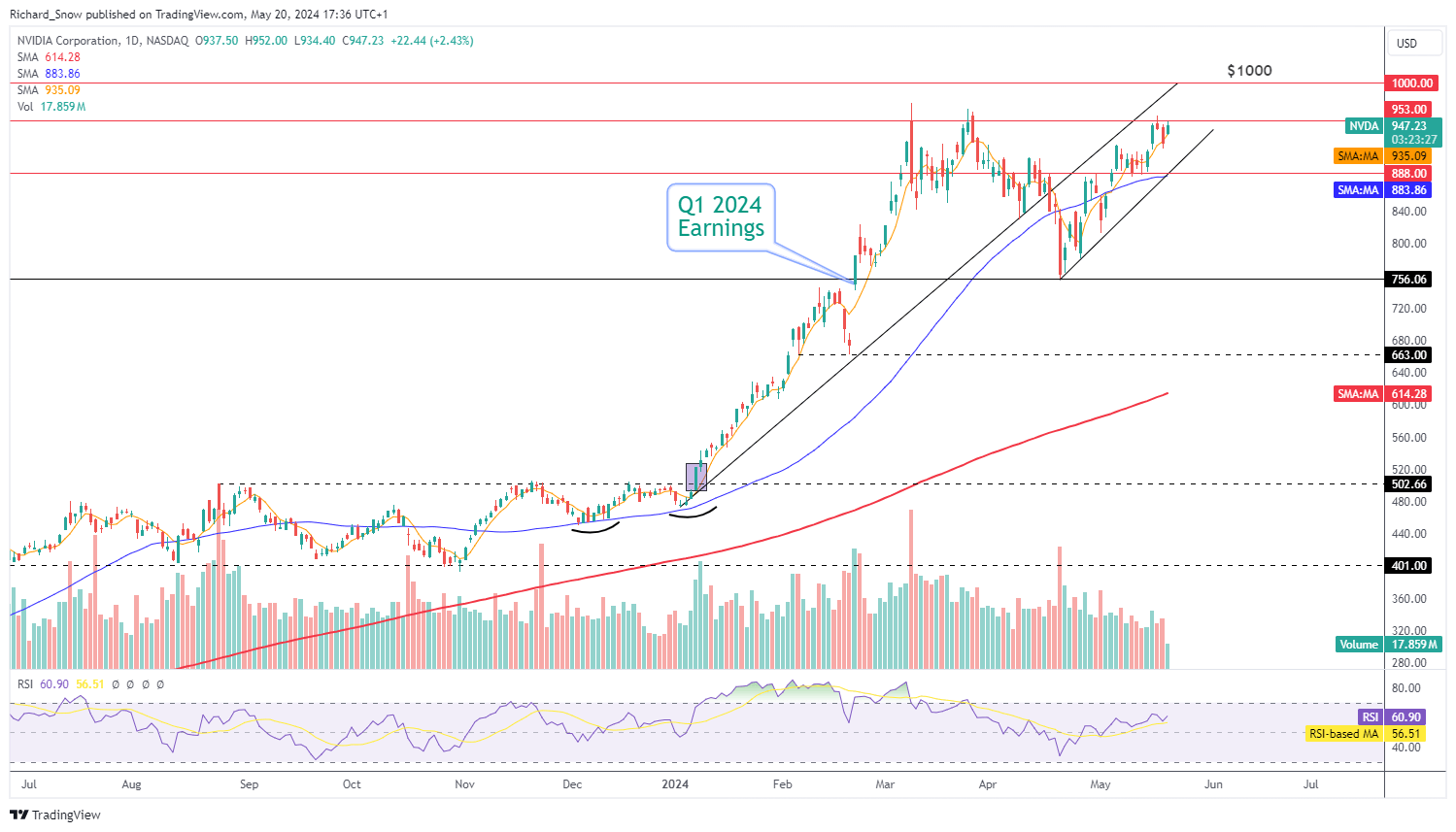 NVIDIA is set to release its Q1 FY25 financial results on May 22, 2024, with expectations of delivering another record revenue and margin. In the previous earnings season, Nvidia stocks surged by nearly 10% on the earnings date. Will the forthcoming report help NVIDIA’s stock price mark another all-time high or even reach a four-digit price tag for the first time?