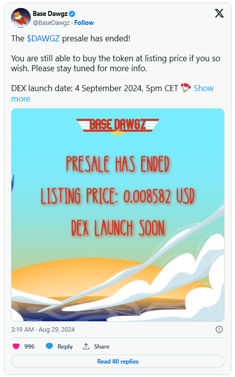 The project’s native token, $DAWGZ, is set to debut on a decentralized exchange (DEX) on September 4 at 5pm CET.