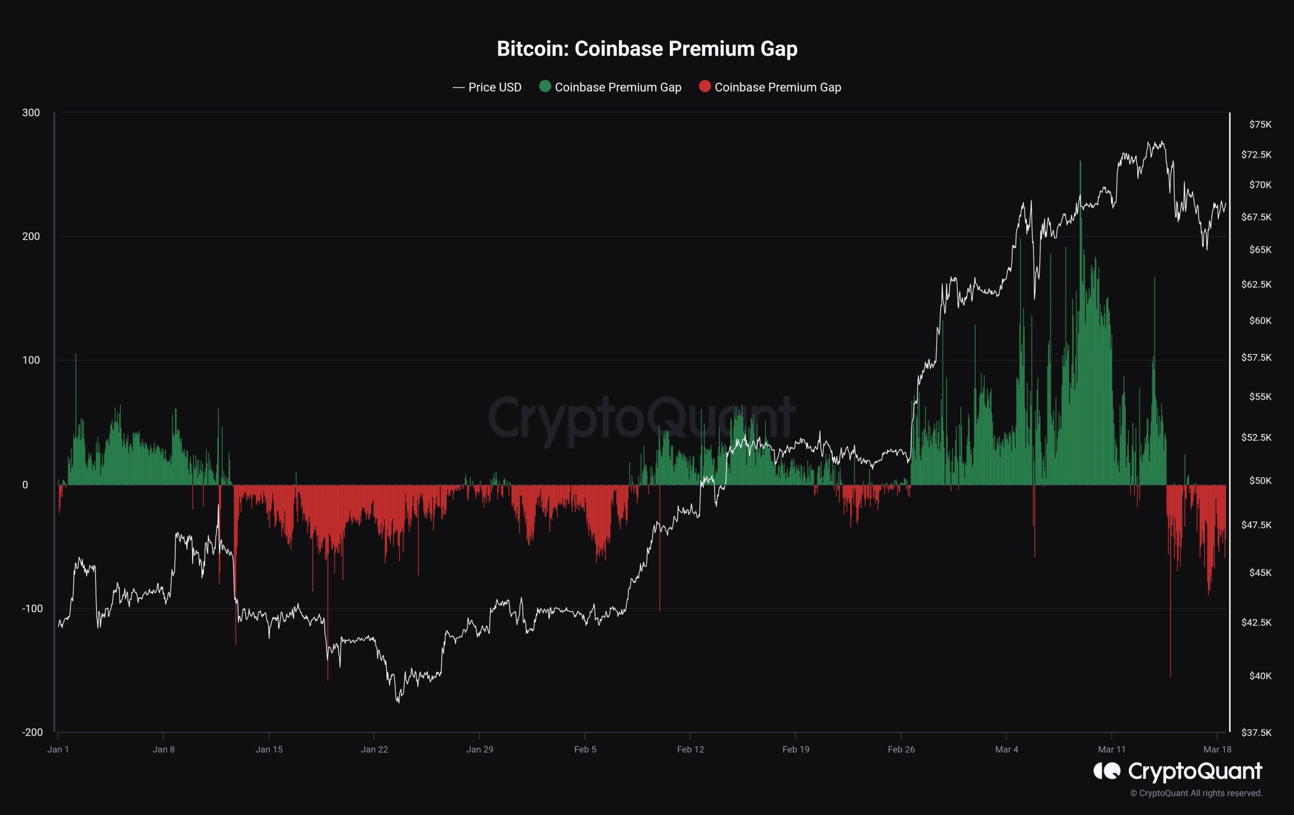 At the end of the positive Coinbase Premium Gap streak, Bitcoin had been able to achieve a new all-time high above $73,800, but as traders have switched to selling on the platform, the coin has dropped almost 9%, with its price now trading around $67,300.