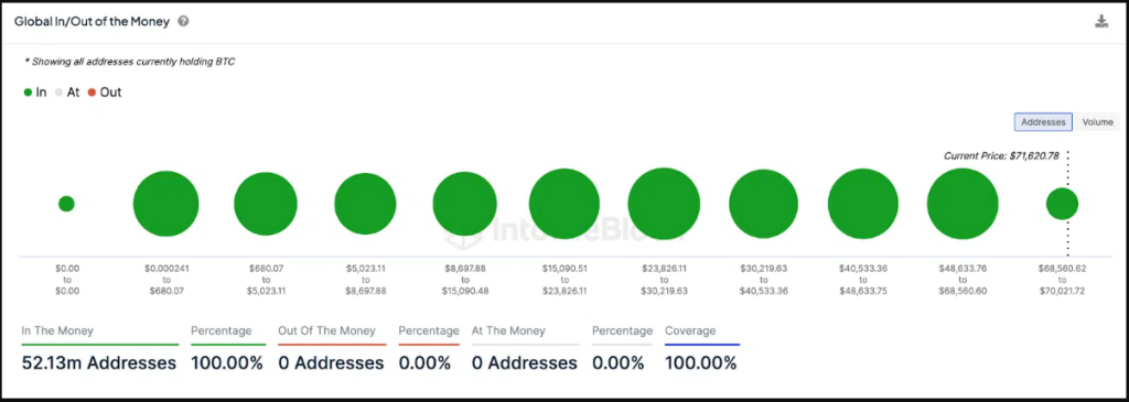 IntoTheBlock’s “Global In/Out of the Money” chart offers a visual feast, showcasing that in this era of Bitcoin’s price discovery, nearly all of the 52 million holder addresses are now enjoying profits. This absence of selling pressure, combined with the rising institutional tide, paints a canvas of explosive potential.