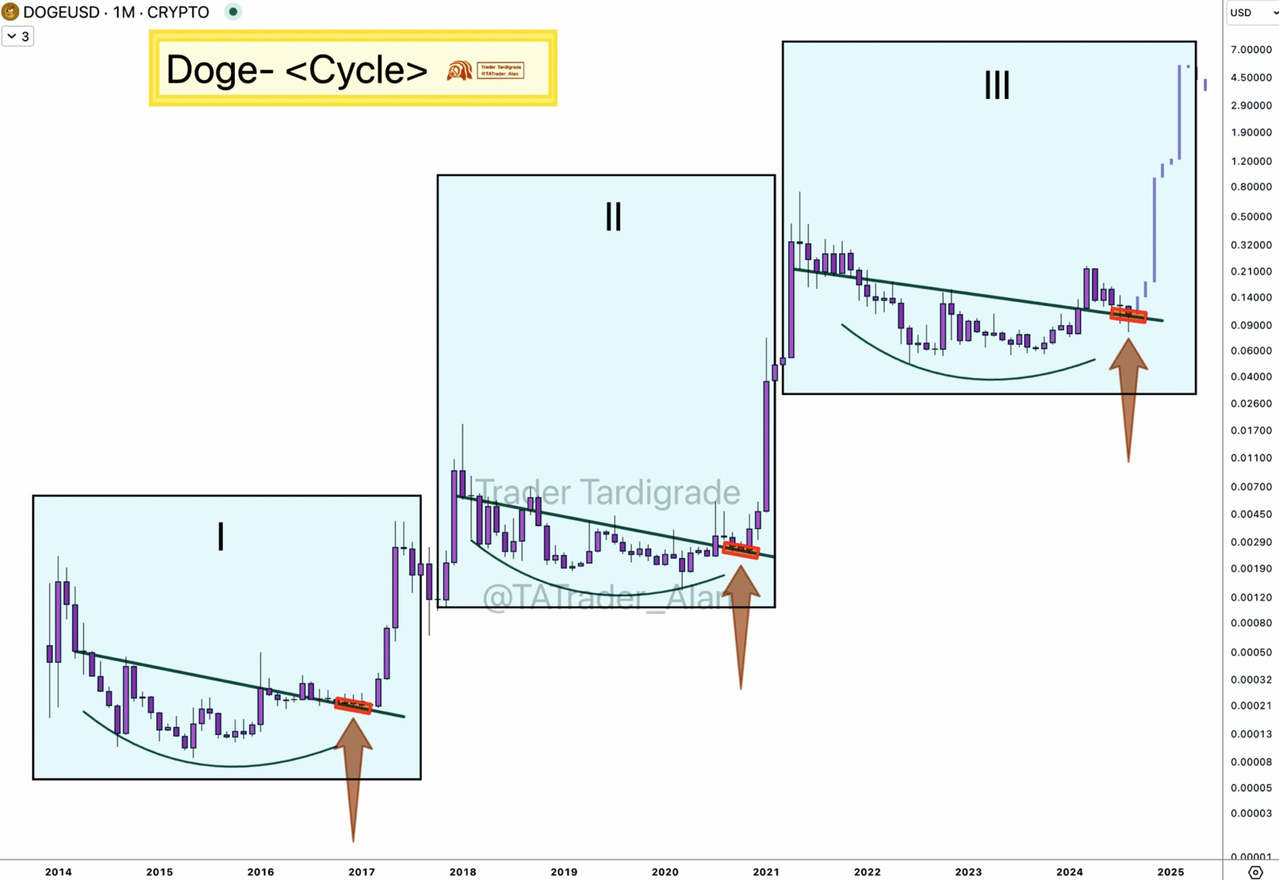 DOGE is currently going through its third market cycle, and the ongoing consolidation process along the trend line is similar to previous cycles.