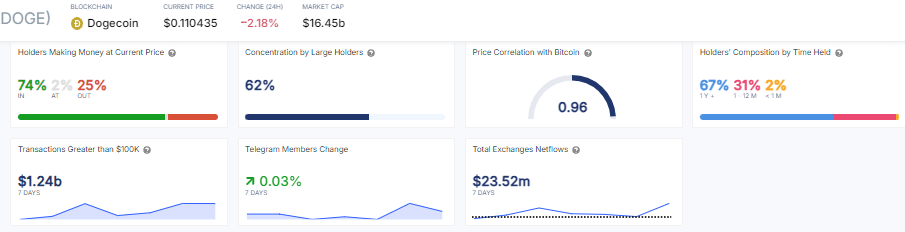 On-chain data supports the bullish outlook for DOGE. Currently, 74% of holders are profitable, and the largest holders control 62% of the supply.