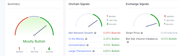On-chain signals indicate bullish market sentiment, with a summary rating of 4 (Mostly Bullish).