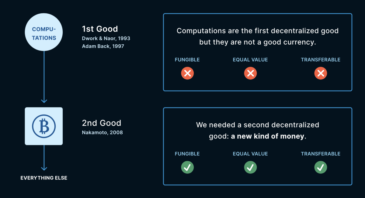 But this also means that proof-of-work computations are bespoke goods. They aren’t fungible, they can’t be re-spent,[5] and they don’t solve the coincidence-of-wants problem. These missing monetary properties prevent computations from being currency. Despite the name, there is no incentive for an email delivery provider to want to accumulate HashCash, as there would be for actual cash.