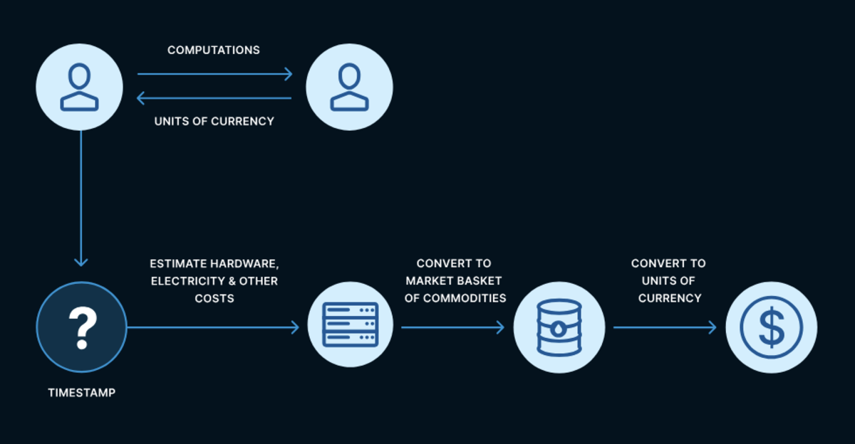 Early digital currencies attempted to price computations by attempting to collectively measure the “cost of computing”. Wei Dai, for example, proposes the following hand-wavy solution in b-money: