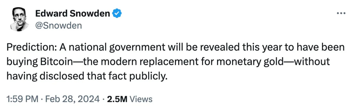 This is not to say that I don’t believe this week is the beginning of much larger adoption that would likely drive the price of bitcoin higher. As I said on the “What Bitcoin Did” podcast, I believe that there is at least one, if not several, nation-states looking at putting bitcoin on their sovereign balance sheets, and that this will kick off a period of game theory for the digital asset revolution the likes of which we haven’t seen yet. Just days after I said that, yesterday Edward Snowden came out and postulated the same.