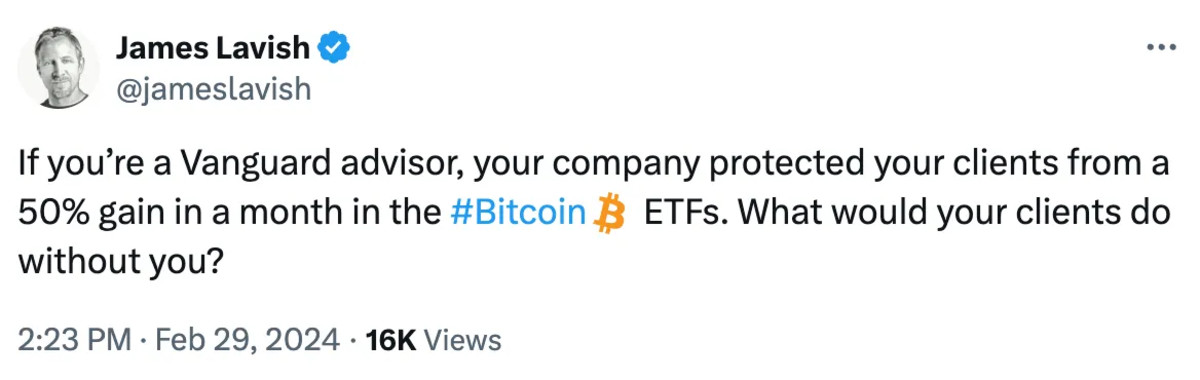 My Twitter feed over the last week has been replete with people triumphantly celebrating, bragging, and taking shots at those who doubted that the price would ever go back up again. Here’s one example from my brother James Lavish, who I know well enough to know he won’t mind me using him as an example because he knows I respect the shit out of him. Behold Exhibit A: James talking shit to Vanguard.