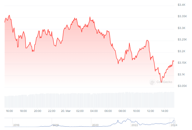 Currently, Ethereum (ETH) is experiencing a decline of nearly 10% and is currently trading at $3,138. The 24-hour trading volume for ETH stands at $29 million.